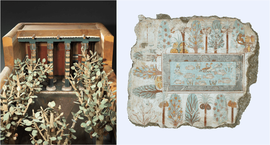 Right: fragment from the tomb of Nebamun, today in the British Museum EA37983, showing a pool surrounded by trees. (c) Trustees of the British Museum.