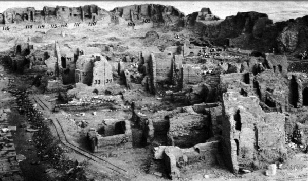 It is possible that some of these ostraca come from the village Djeme (built in and around Medinet Habu, the mortuary temple of Rameses III), which is especially well documented during the 7th and 8th centuries. Until the 1920s, remains of houses from this period survived, but they were removed to reveal the original ground level of the pharaonic temple. Photographs and plans of the houses provide an impression of the ground floor layout and cellars of over 130 houses. Houses had an entrance room, containing a recess for large water containers, which led to another room and staircase – the type of common rooms mentioned in the first ostracon above. Today, remains of these late houses are only visible on the edges of the temple complex, where they were built on top of the ancient mudbrick perimeter wall.
