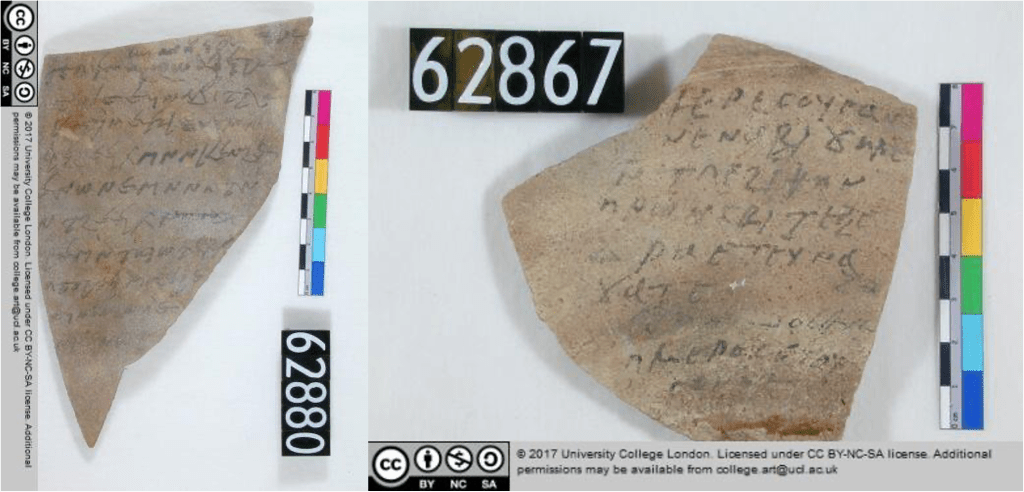 Another ostracon is slightly different. Rather than note the parcel to be distributed, UC62867 (O.CrumVC 14) names the individual involved: “Susanna shall receive the upper storage room before the door and the veranda, which is to be opened up(?).” In this case, the mediators themselves may have specified who received what, or this ostracon marks the final decision and no long papyrus legal document was written that recorded her share – having a papyrus document written up would have been a much more expensive venture!